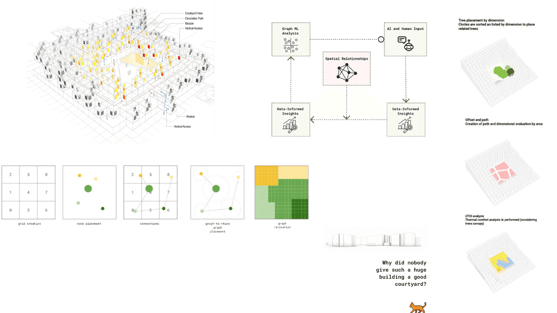 AI co-pilot for courtyard design. Parametric geometry responds to user inputs and environmental conditions, while a trained LoRA-integrated LLM critiques and guides decisions in real time. The focus is on performance, spatial quality, and visual clarity.
